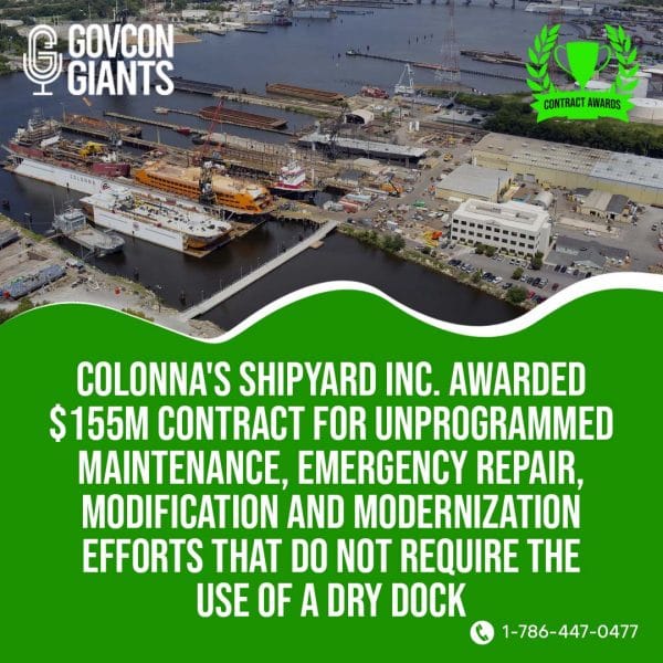 Colonna’s Shipyard Inc. awarded $155M contract for unprogrammed maintenance, emergency repair, modification and modernization efforts that do not require the use of a dry dock